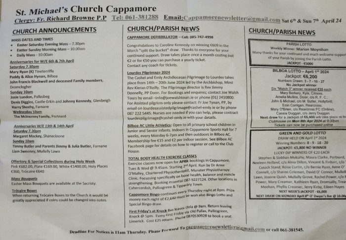 Cappamore Church and Parish Newsletter Posted on April 7, 2024April 7, 2024 by Cappamore Cappamore Church and Parish Newsletter