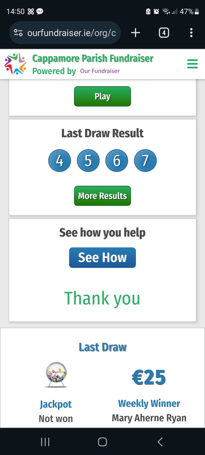 Cappamore St Michael’s Church Lotto Results Posted on April 19, 2024April 19, 2024 by Cappamore Cappamore St Michael’s Church Lotto Results