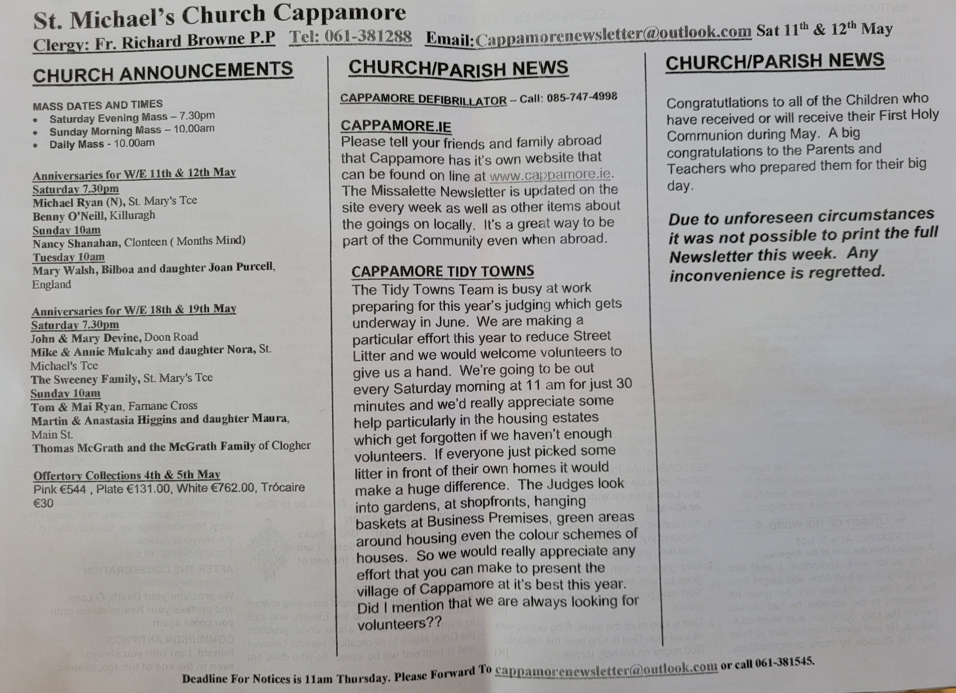 The Youth Choir will sing at the 7.30 evening Mass on Saturday, 25th May. Rehearsals take place in St. Michael’s Church on Thursday, 23rd May from 8 to 9 o’clock. The choir welcomes all Secondary School students and Senior Primary School pupils and, in fact, all that are young at heart! So why not come along and let’s make music together.