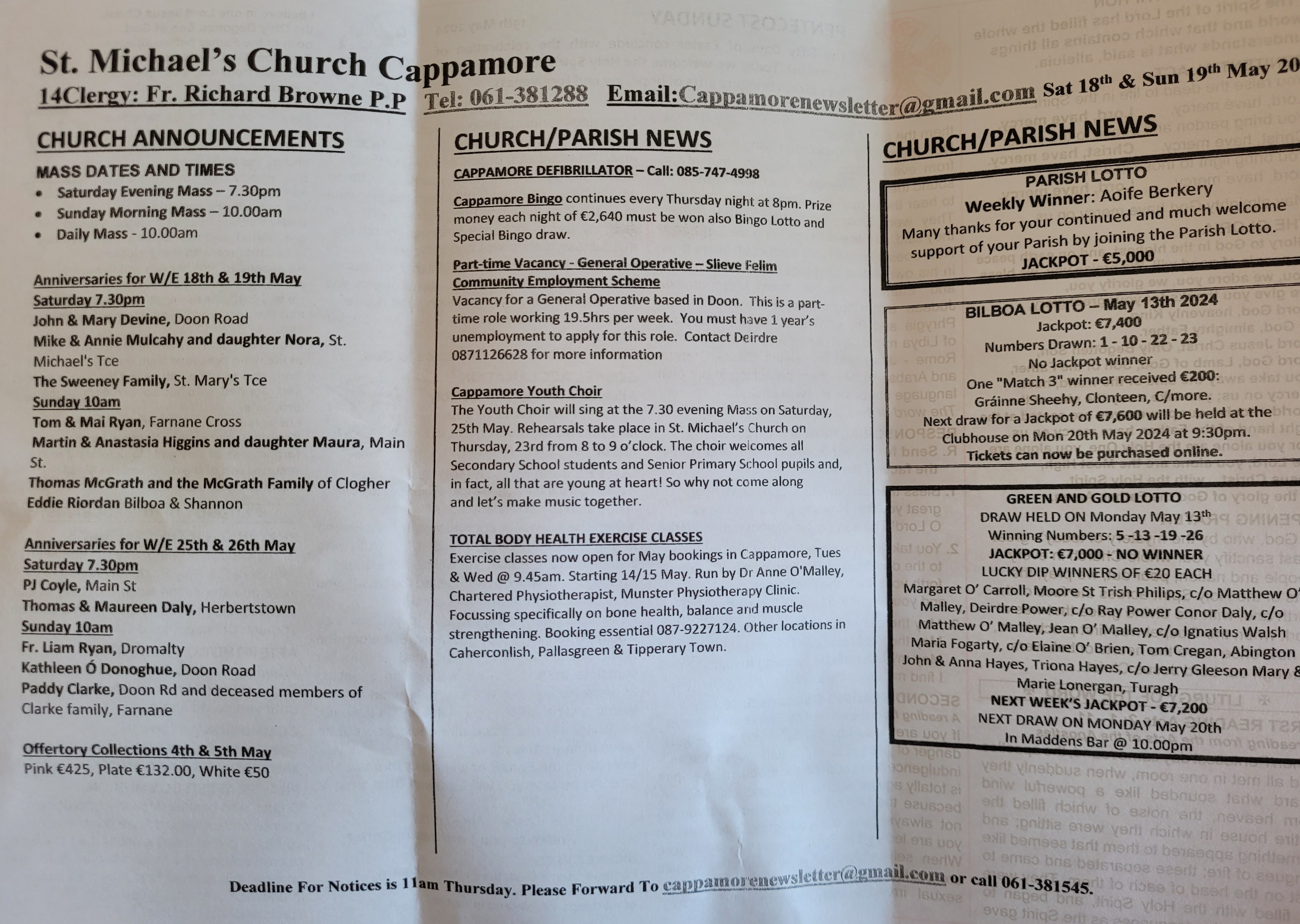 Green and Gold Lotto draw was held on Monday May 13th for Jackpot of €7000 and there was no winner. Lucky Dip winners were Margaret O’ Carroll, Moore St; Trish Philips, c/o Matthew O’ Malley; Deirdre Power, c/o Ray Power; Conor Daly, c/o Matthew O’ Malley; Jean O’ Malley, c/o Ignatius Walsh; Maria Fogarty, c/o Elaine O’ Brien; Tom Cregan, Abington; John & Anna Hayes; Triona Hayes, c/o Jerry Gleeson; Mary & Marie Lonergan, Turagh.