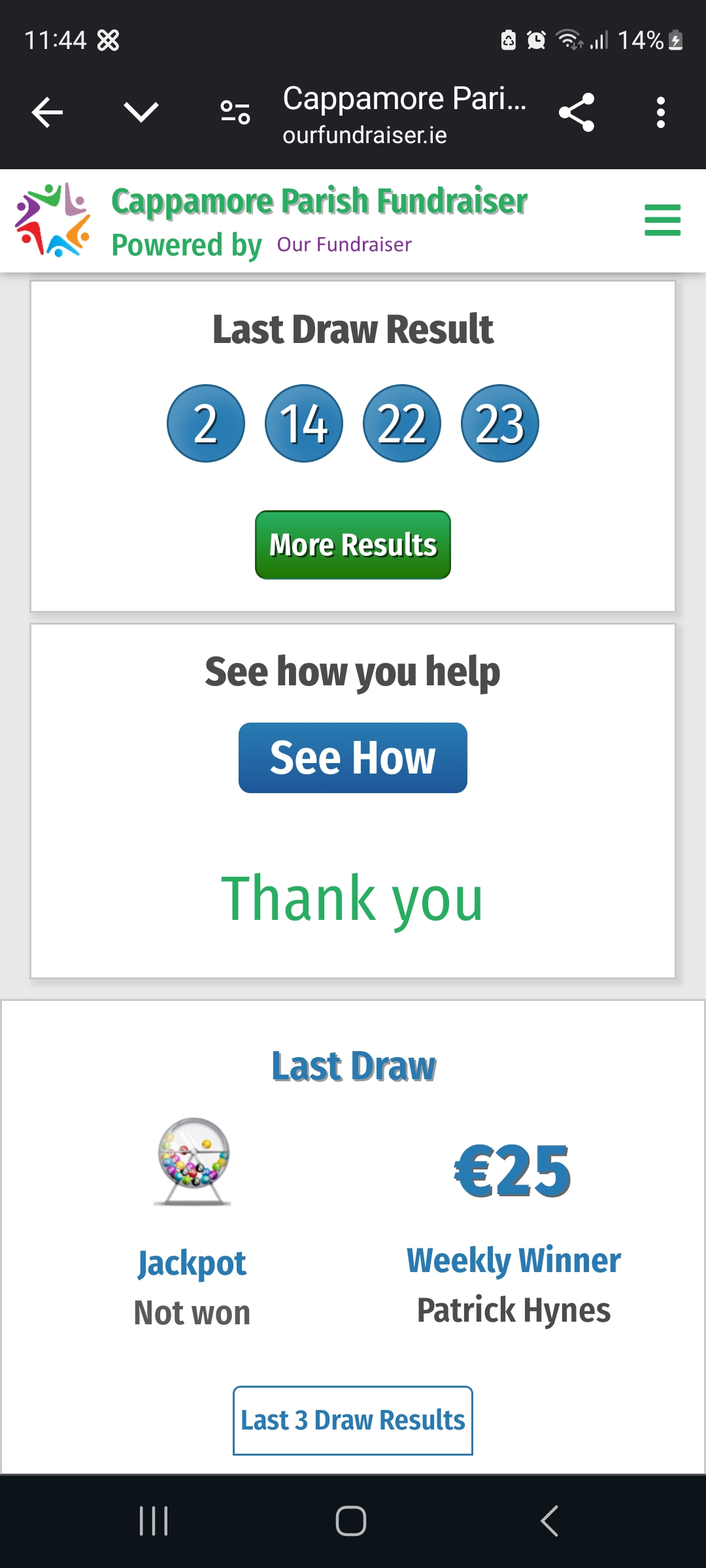 Cappamore St Michael’s Church Lotto Results Posted on June 14, 2024June 14, 2024 by Cappamore Cappamore St Michael’s Church Lotto Results