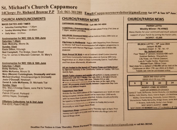 Cappamore Church and Parish Newsletter Posted on June 16, 2024 by Cappamore Cappamore Church and Parish Newsletter