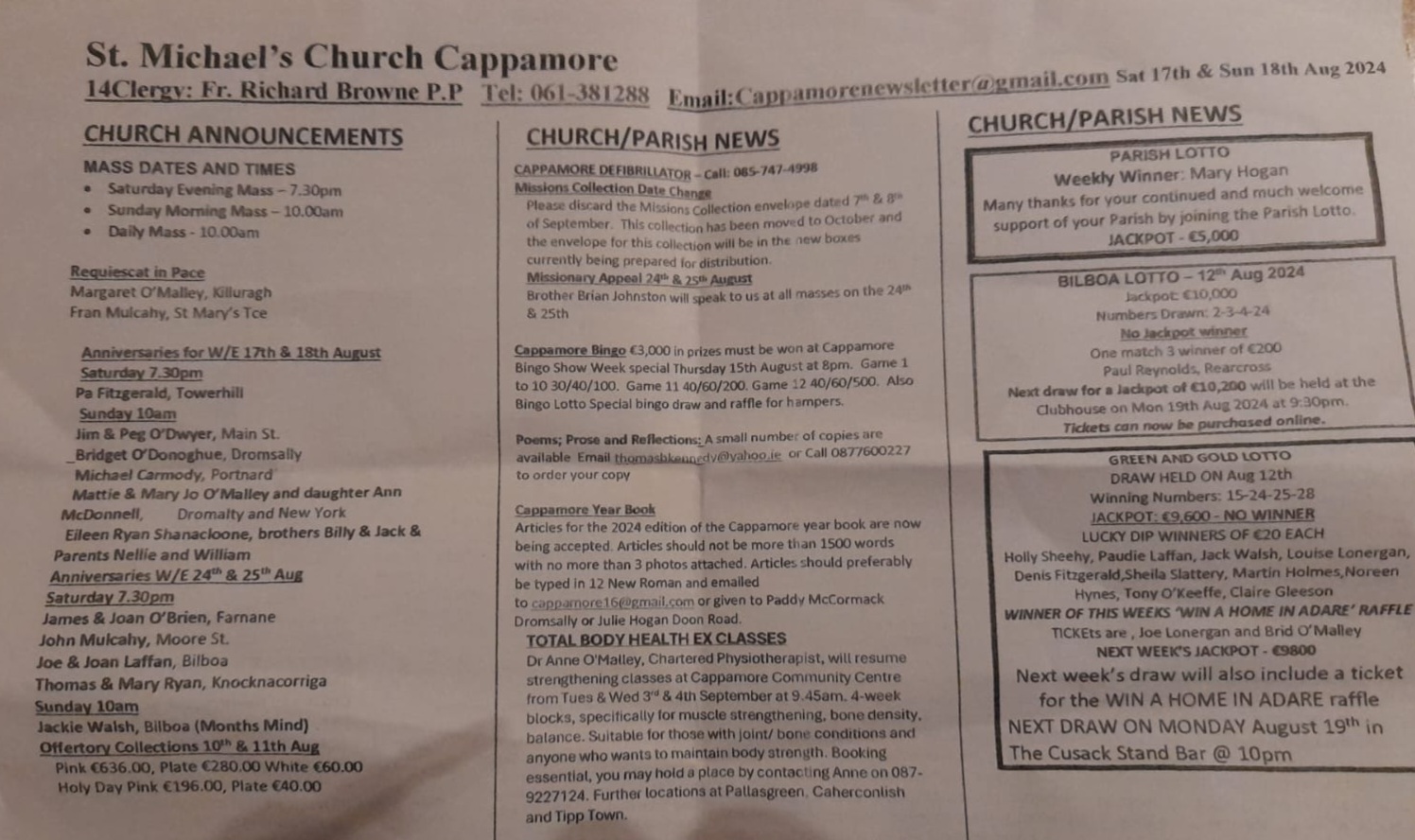 Green and Gold Lotto draw was held on Monday August 19th for Jackpot of €9800 and there was no winner. Lucky Dip winners were Margaret O’ Carroll, Moore St; Edel Blackwell, c/o Daniel O’ Donnell; Kevin O’ Sullivan, Dromsally; Kathleen Quish, Mullally Grove; Conor Walsh, Farnane; Davy Lonergan, c/o Mike Lonergan; Ann Healy; Kathleen Richardson, Lacka; Lily Butler; Dylan Halpin, c/o Tony Mulcahy.