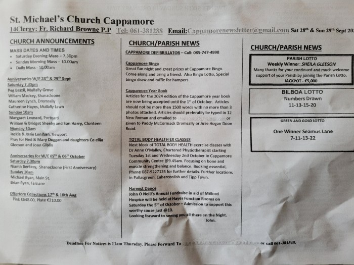 The deadline for acceptance of articles to the 2024 edition of the Yearbook is Tuesday the 1st of October. Articles should not be more than 1500 words with no more than 3 photos attached. Articles should preferably be typed in 12 New Roman and emailed to cappamore16@gmail.com or given to Paddy McCormack Dromsally or Julie hogan Doon road.