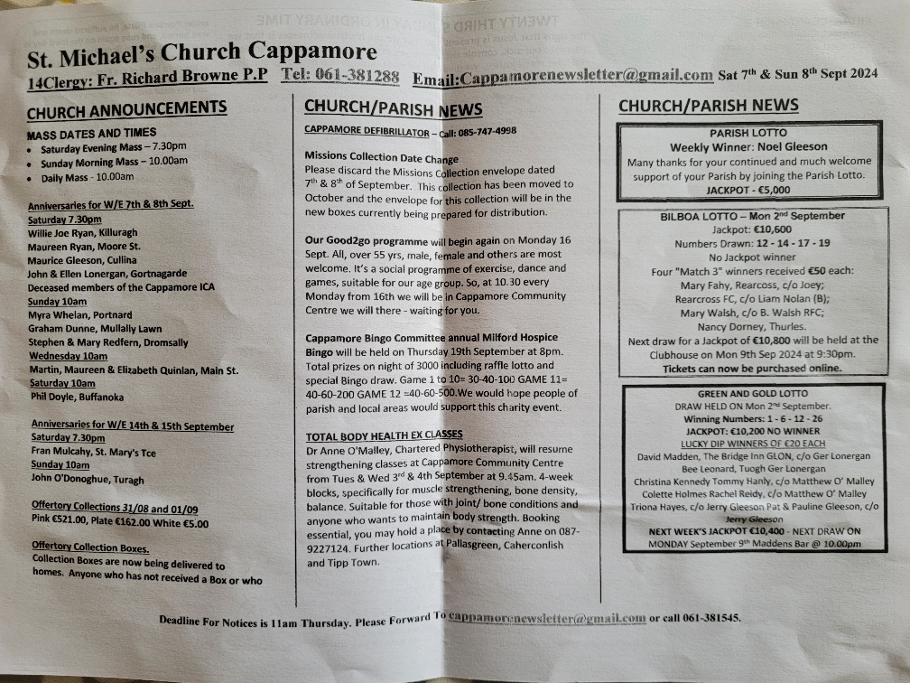 Cappamore Church and Parish Newsletter Posted on September 8, 2024September 8, 2024 by Cappamore Cappamore Church and Parish Newsletter