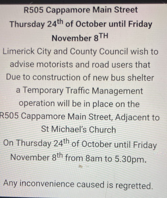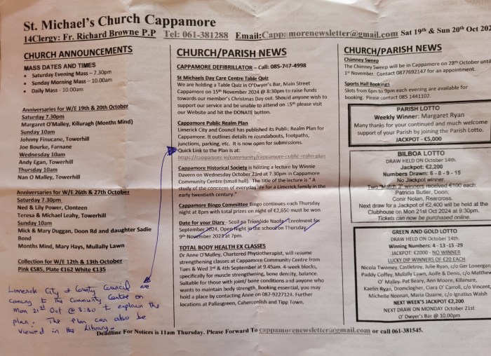 Limerick City and Council has published its Public Realm Plan for Cappamore. It outlines details re roundabouts, footpaths, junctions, parking, bus stop, etc. It is available in the Library for viewing. Also on www.cappamore.ie [cappamore.ie], in the community section. It is open for public submissions until 11 Nov. Quick Link to the Plan is at https://cappamore.ie/community/cappamore-public-realm-plan [cappamore.ie] Details on how to make a submission are on the web site.