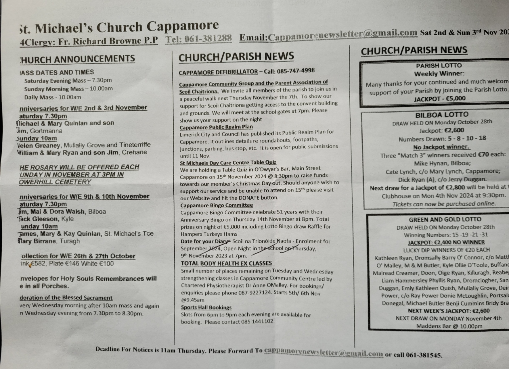 Cappamore Church and Parish Newsletter Posted on November 3, 2024 by Cappamore Cappamore Church and Parish Newsletter