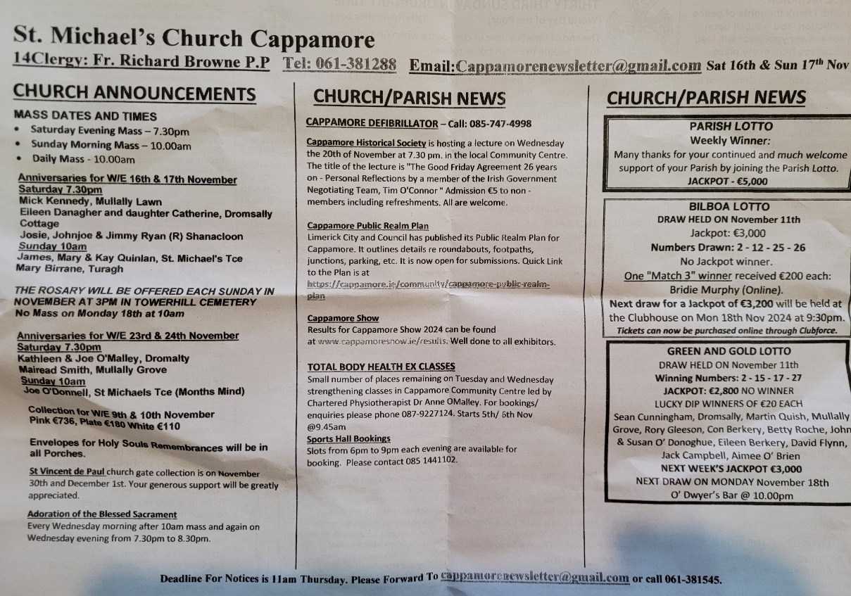 Cappamore Church and Parish Newsletter Posted on November 17, 2024 by Cappamore Cappamore Church and Parish Newsletter