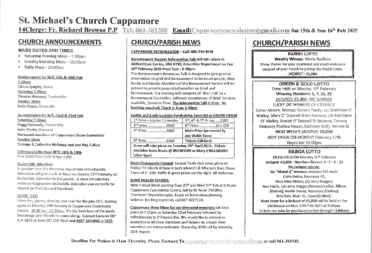 Next draw for a Jackpot of €2,000 will be held at the Clubhouse on Monday 3rd March 2025 at 9:30pm.