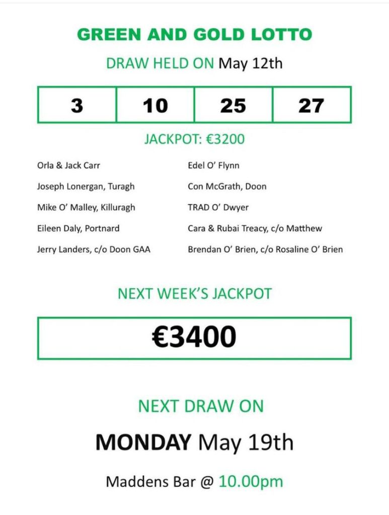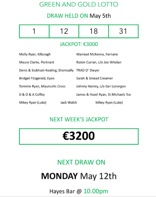 Next draw for a Jackpot of €4,200 will be held at the Clubhouse on Mon 19th May 2025 at 9:30pm.