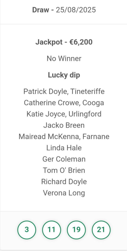 Posted in Green & Gold Lotto ResultsTagged Cappamore GAA & Camogie Club Lotto Results