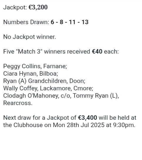 Next draw for a Jackpot of €4,400 will be held at the Clubhouse on Mon 26th May 2025 at 9:30pm.