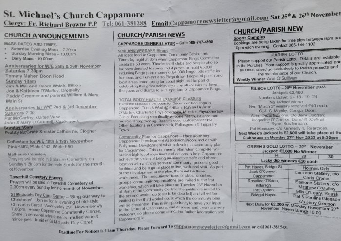 Cappamore St Michael’s Church Lotto Results Posted on November 24, 2023November 24, 2023 by Cappamore